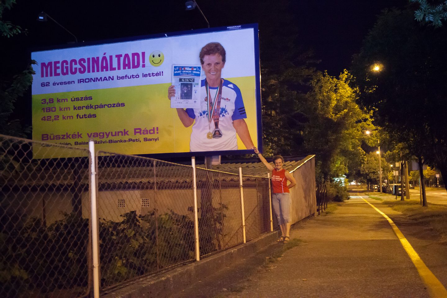 „2015. július 25-én Anyukám 62 évesen végigcsinálta élete egyik nagy versenyét, befutó lett az IRONMAN-en, azaz az eXtremeMan Nagyatádon. Több mint 16 órát sportolt egyben. Hőségben, majd éjszaka már viharban. 3,8 km-t úszott, 180 km-t biciklizett és lefutott egy maratoni távot, ami 42,2 km. Egy éve készült erre a versenyre. Szerettük volna meglepni valami különleges ajándékkal, hogy elmondhassuk, mennyire büszkék vagyunk rá. Így hát csináltattunk neki egy óriásplakátot a háza mellé. Lecsaltuk este egy szelektív hulladék-elvitellel egybekötött kutyasétára. És ő mit sem sejtett.”