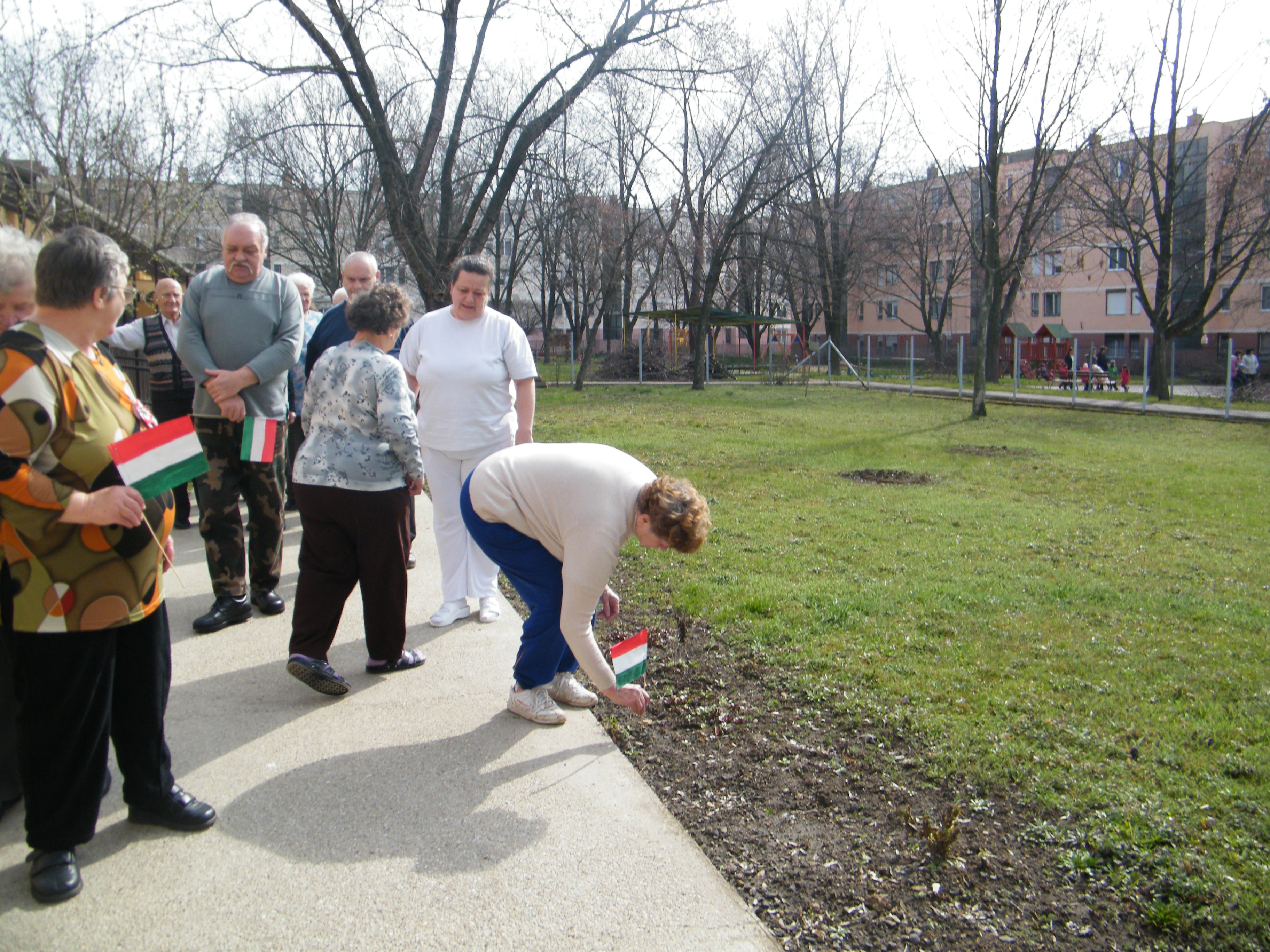 Hasonlóan 1848-hoz, amikor ennek hangjaira oszlott el a nép, mi, az Idősek Klubja tagjai a Béke Szabadság Egyetértés jelében a klubútja mellé tűztük ki a nemzeti színű zászlóinkat. Ezzel egyedülálló,ünnepi kinézetet kölcsönöztünk az útnak.